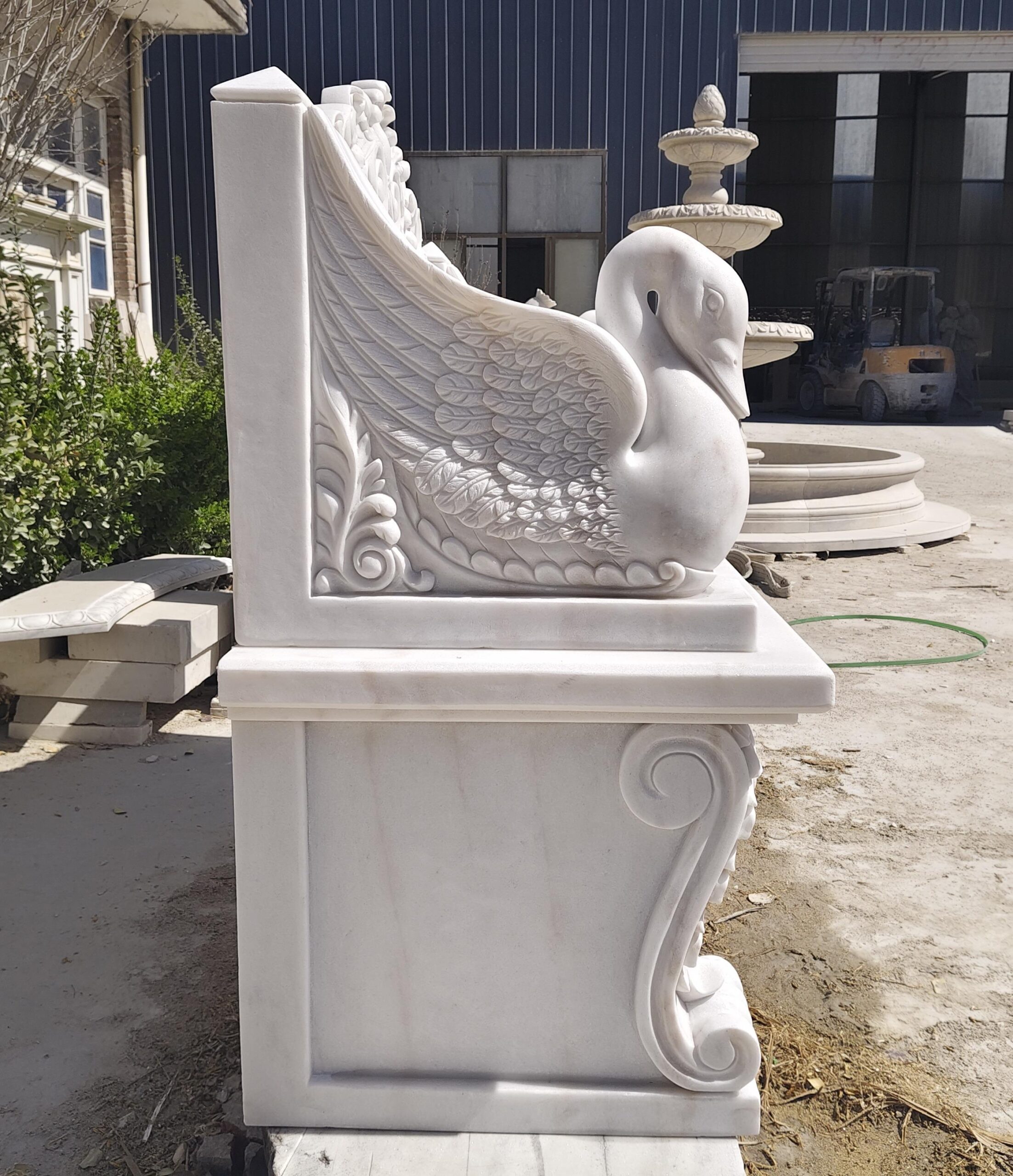 Marble Swan Bench from AmazingStatuary.com is masterfully carved from a single, solid block of natural marble, honoring a sculptural tradition that spans thousands of years. This method of carving—rather than casting or assembling—ensures both structural integrity and artistic purity, allowing the natural beauty of the stone to remain uninterrupted. Each piece begins as raw marble, selected for its density, veining, and tonal consistency, then slowly revealed through the disciplined hand of a skilled artisan.