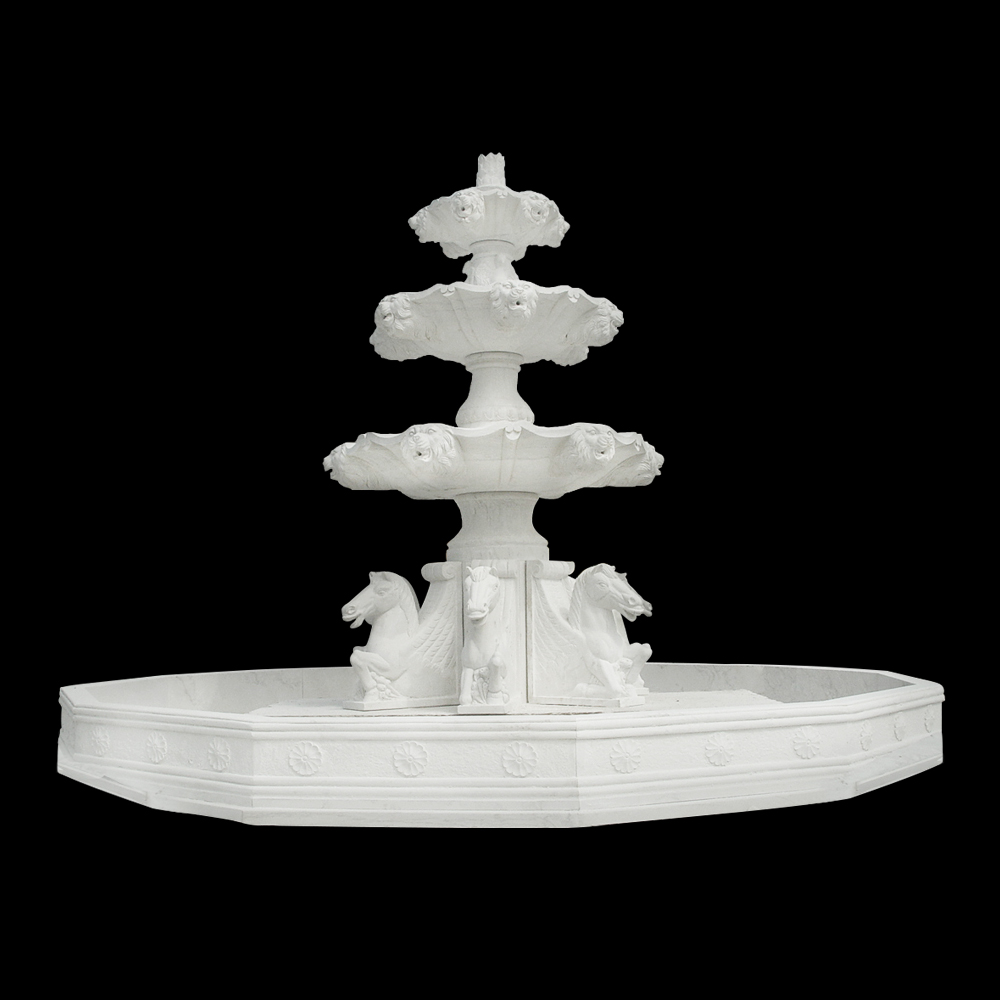 SEO Meta: Marble Three Tier Lion and Horse Fountain with Basin in White – AmazingStatuary.com
